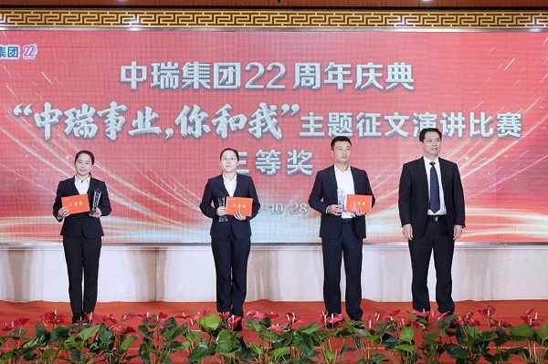 “中瑞事業(yè),你和我”主題征文演講比賽在慶典上精彩上演。來自集團各條戰(zhàn)線上的20名職工代表,從自身崗位出發(fā),聲情并茂地講述著自己和中瑞的故事,訴說著自己感恩事業(yè)平臺、與中瑞一起成長的點點滴滴,歌頌了拼搏進(jìn)取、勤勞奉獻(xiàn),服務(wù)真誠、擔(dān)當(dāng)作為的中瑞人品格。