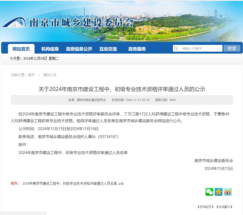 關(guān)于2024年南京市建設(shè)工程中、初級專業(yè)技術(shù)資格評審?fù)ㄟ^人員的公示