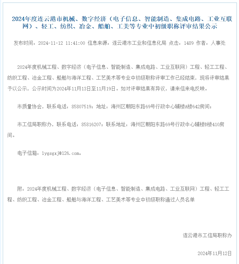 2024年度連云港市機(jī)械、數(shù)字經(jīng)濟(jì)(電子信息、智能制造、集成電路、工業(yè)互聯(lián)網(wǎng))、輕工、紡織、冶金、船舶、工美等專業(yè)中初級(jí)職稱評(píng)審結(jié)果公示