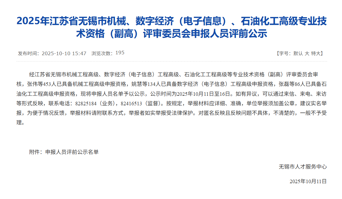 2025年江蘇省無錫市機(jī)械、數(shù)字經(jīng)濟(jì)(電子信息)、石油化工高級專業(yè)技術(shù)資格(副高)評審委員會申報人員評前公示