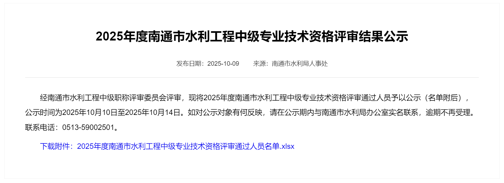 2025年度南通市水利工程中級專業(yè)技術(shù)資格評審結(jié)果公示
