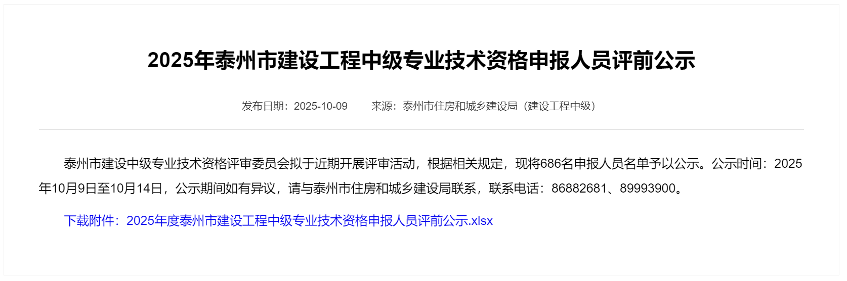 | 2025年度泰州市建設(shè)工程中級(jí)專業(yè)技術(shù)資格申報(bào)人員評(píng)前公示 |
