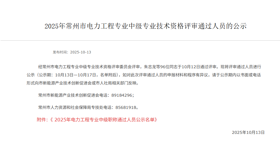 2025年常州市電力工程專業(yè)中級(jí)專業(yè)技術(shù)資格評(píng)審?fù)ㄟ^人員的公示