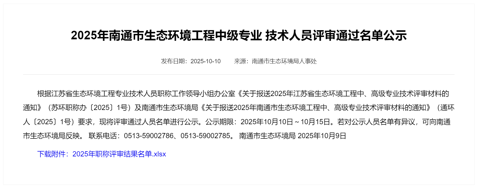 2025年南通市生態(tài)環(huán)境工程中級專業(yè) 技術(shù)人員評審?fù)ㄟ^名單公示