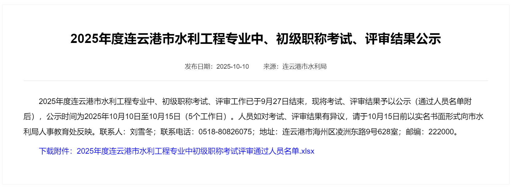 2025年度連云港市水利工程專業(yè)中、初級職稱考試、評審結(jié)果公示