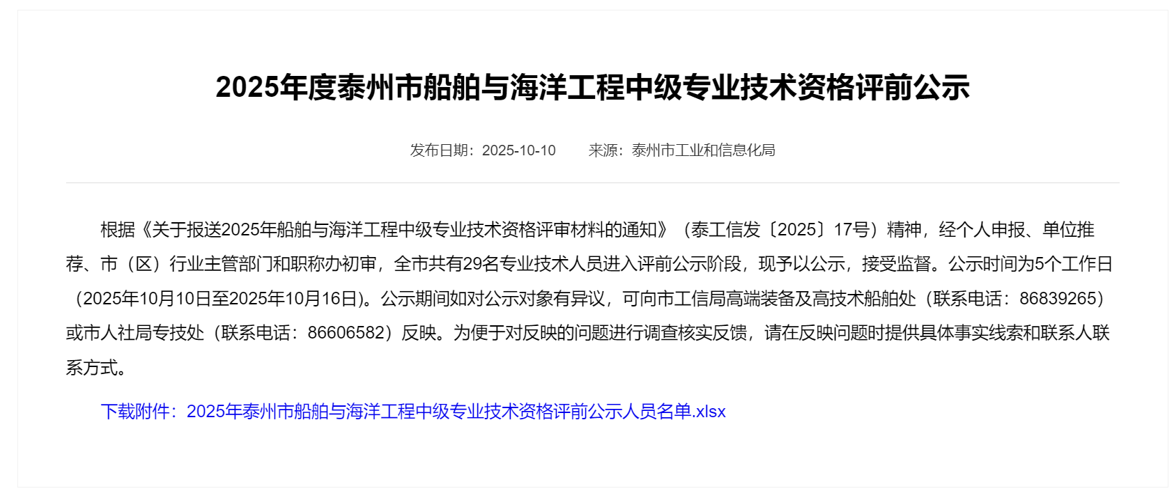 2025年度泰州市船舶與海洋工程中級專業(yè)技術資格評前公示