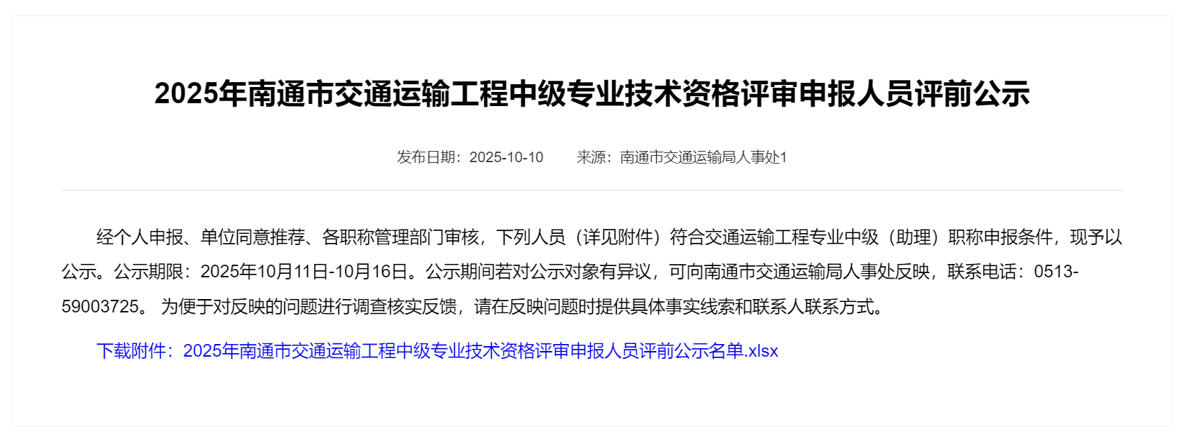 2025年南通市交通運輸工程中級專業(yè)技術(shù)資格評審申報人員評前公示