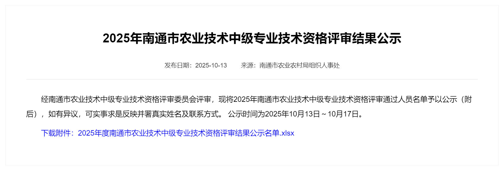 2025年南通市農(nóng)業(yè)工程中級專業(yè)技術(shù)資格評審結(jié)果公示