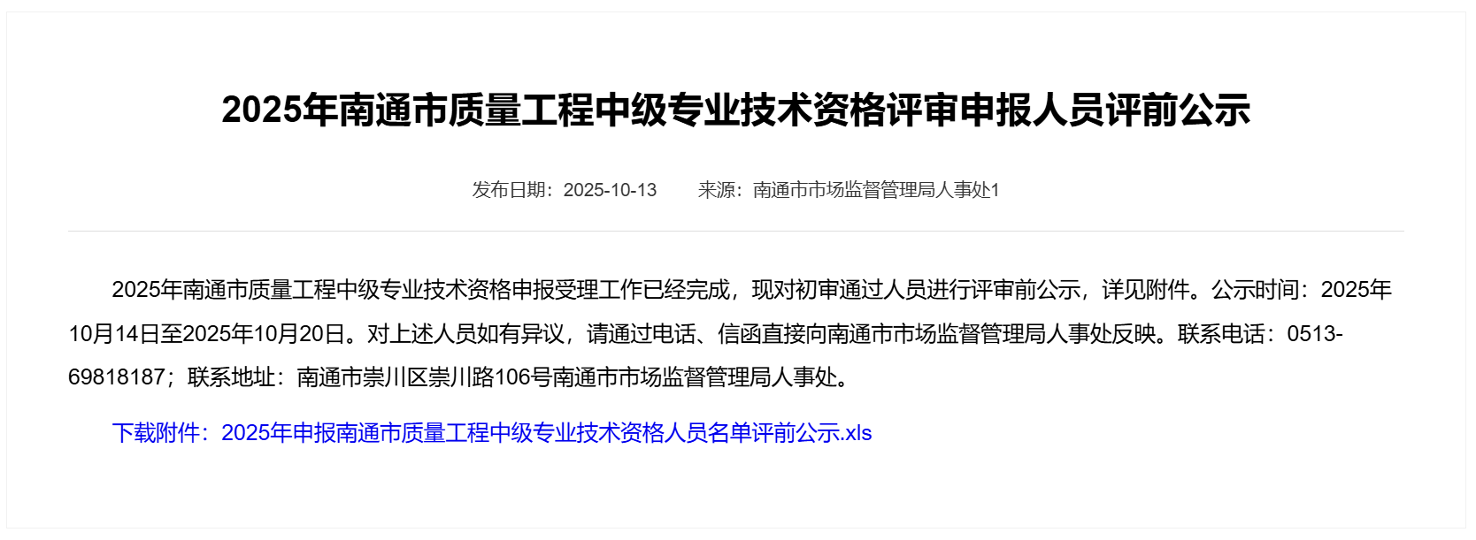2025年南通市質(zhì)量工程中級專業(yè)技術(shù)資格評審申報人員評前公示