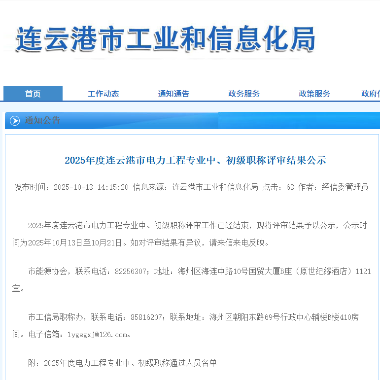 2025年度連云港市電力工程專業(yè)中、初級職稱評審結(jié)果公示