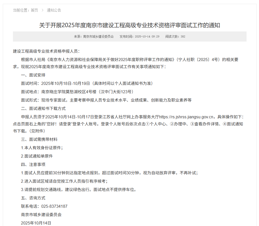 2025年度南京市建設(shè)工程高級專業(yè)技術(shù)資格評審面試工作的通知