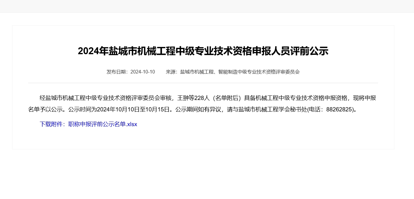 評前公示 | 2024年鹽城市機(jī)械工程中級專業(yè)技術(shù)資格申報人員評前公示