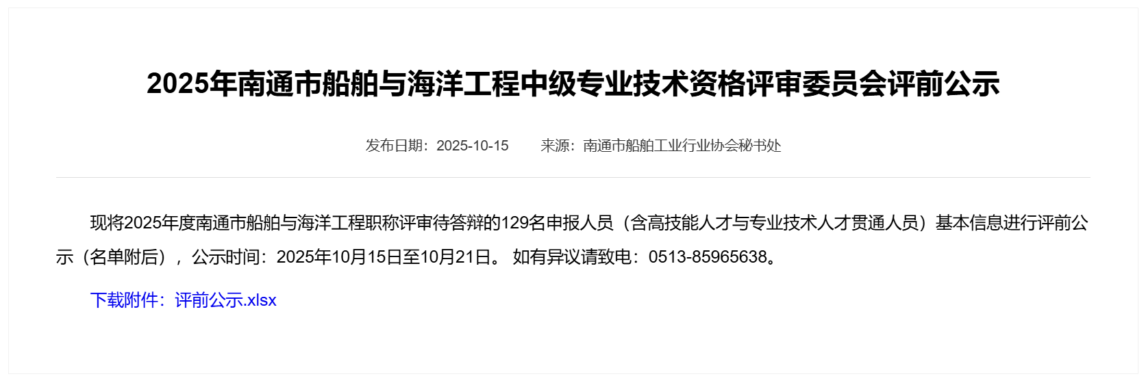 2025年南通市船舶與海洋工程中級專業(yè)技術(shù)資格評審委員會評前公示