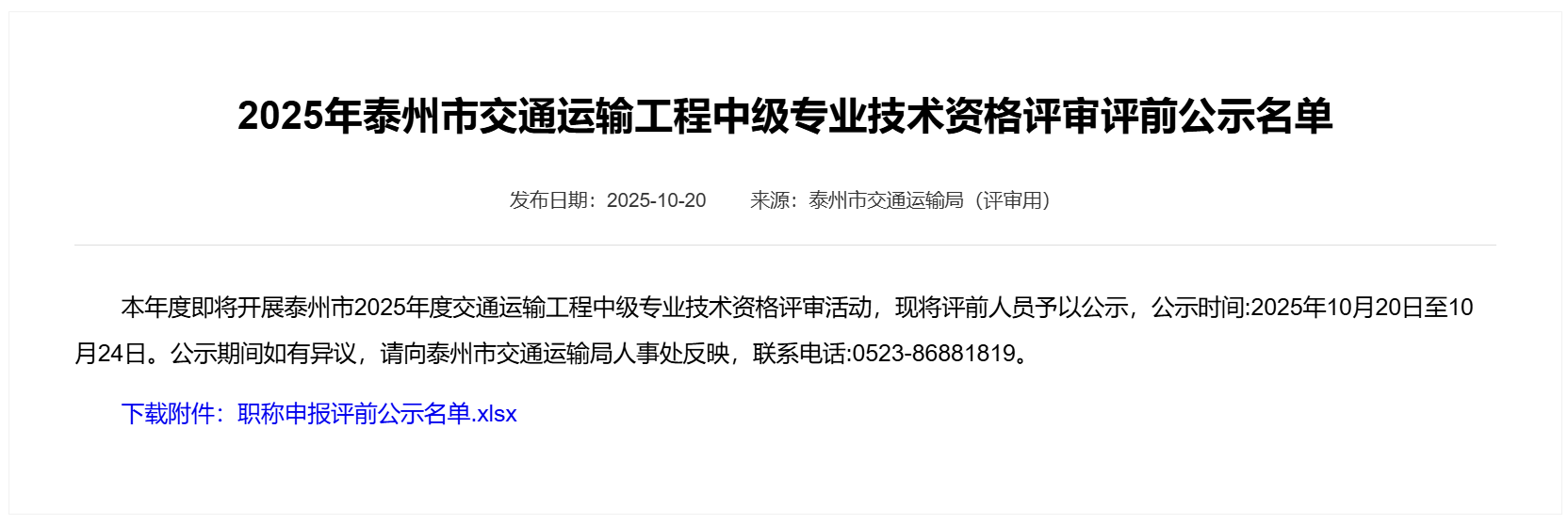 2025年泰州市交通運輸工程中級專業(yè)技術(shù)資格評審評前公示名單