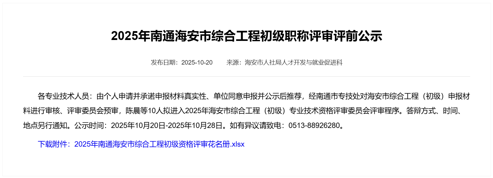 | 2025年南通海安市綜合工程初級資格評審花名冊 |