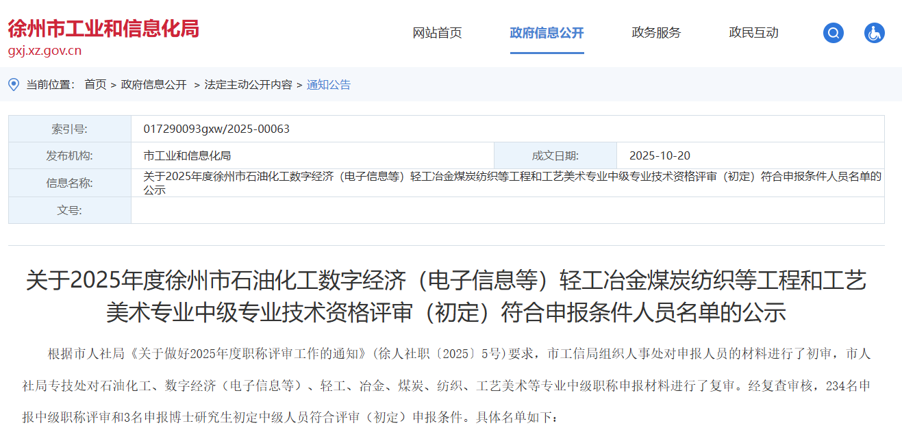關(guān)于2025年度徐州市石油化工數(shù)字經(jīng)濟(jì)(電子信息等)輕工冶金煤炭紡織等工程和工藝美術(shù)專(zhuān)業(yè)中級(jí)專(zhuān)業(yè)技術(shù)資格評(píng)審(初定)符合申報(bào)條件人員名單的公示