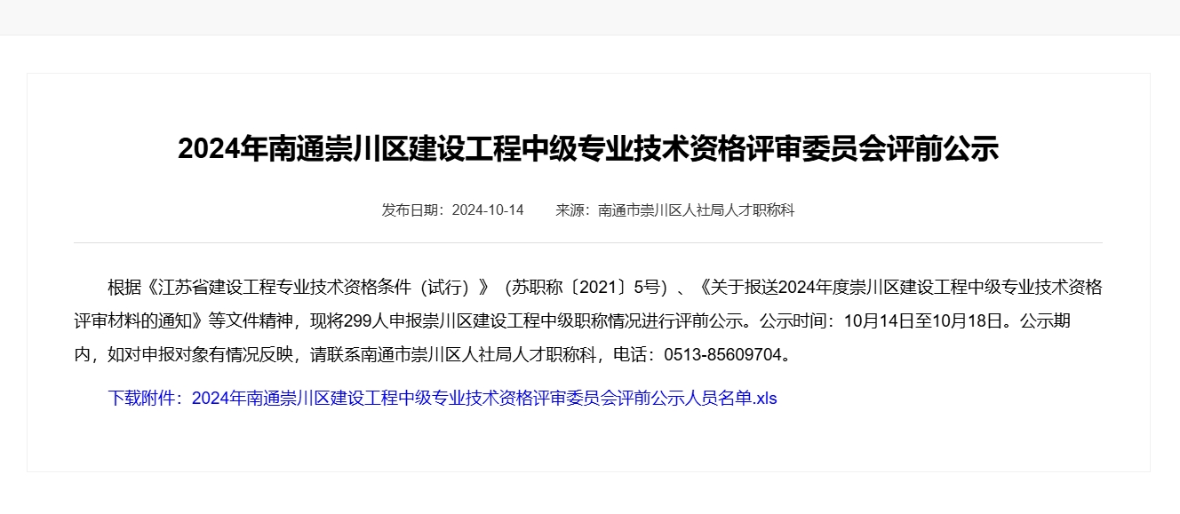 | 2024年南通崇川區(qū)建設(shè)工程中級(jí)專業(yè)技術(shù)資格評(píng)審委員會(huì) |