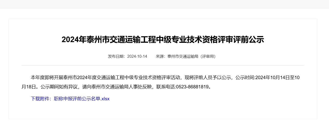 評前公示 |2024年泰州市交通運輸工程中級專業(yè)技術(shù)資格評審評前公示