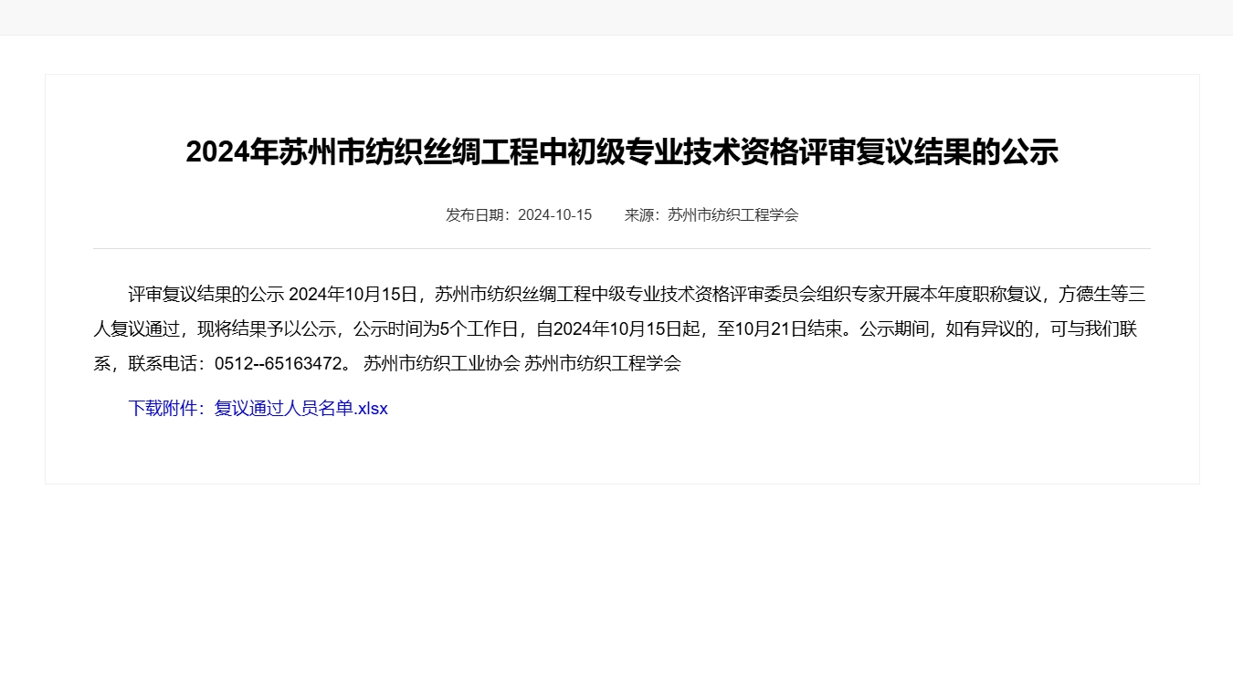 評(píng)審結(jié)果 | 2024年蘇州市紡織絲綢工程中初級(jí)專業(yè)技術(shù)資格評(píng)審復(fù)議結(jié)果的公示