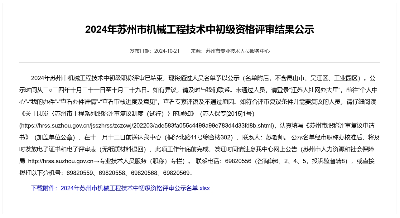 2024年蘇州市機械工程技術中初級資格評審結果公示