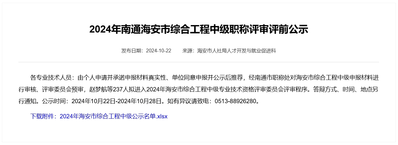 2024年南通海安市綜合工程中級職稱評審評前公示