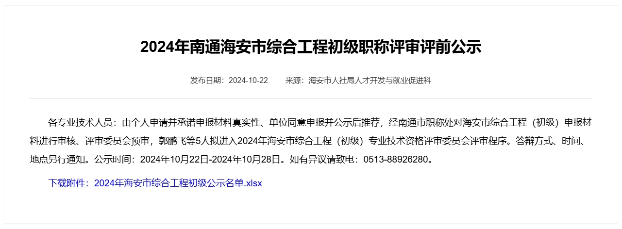 2024年南通海安市綜合工程初級(jí)職稱評(píng)審評(píng)前公示