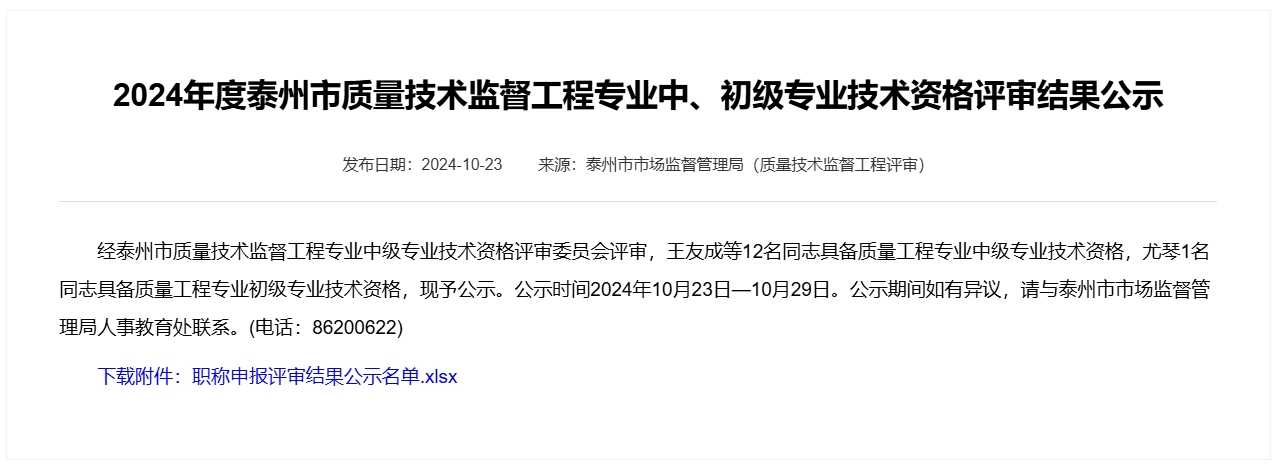 2024年度泰州市質(zhì)量技術(shù)監(jiān)督工程專業(yè)中、初級專業(yè)技術(shù)資格評審結(jié)果公示