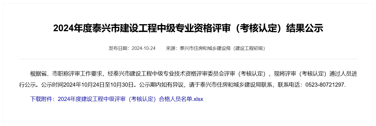 2024年度泰興市建設工程中級專業(yè)資格評審(考核認定)結(jié)果公示