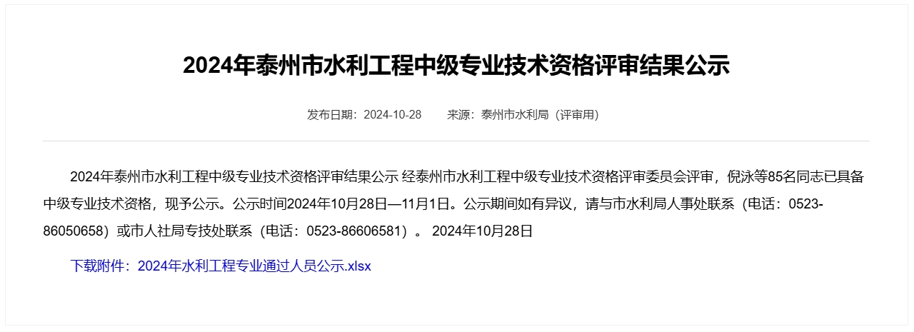 | 2024年泰州市水利工程中級(jí)專業(yè)技術(shù)資格評(píng)審 通過(guò)人員名單 |