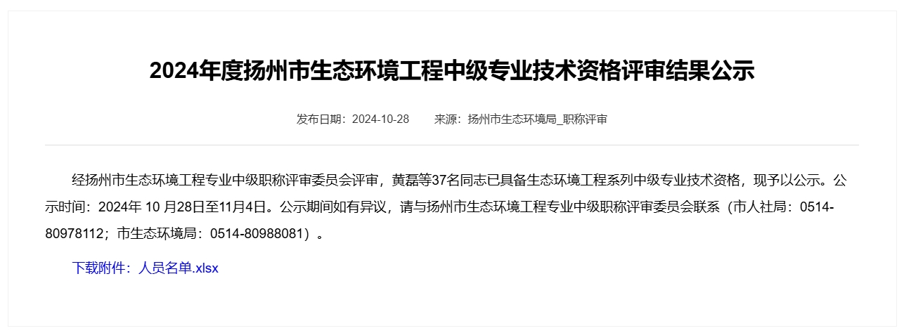 2024年度揚州市生態(tài)環(huán)境工程中級專業(yè)技術(shù)資格評審結(jié)果公示
