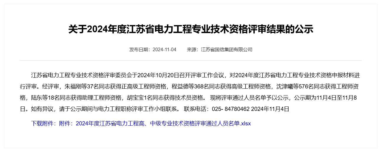 關(guān)于2024年度江蘇省電力工程專業(yè)技術(shù)資格評(píng)審結(jié)果的公示