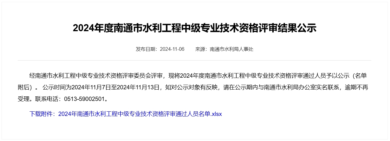 2024年度南通市水利工程中級(jí)專業(yè)技術(shù)資格評(píng)審結(jié)果公示