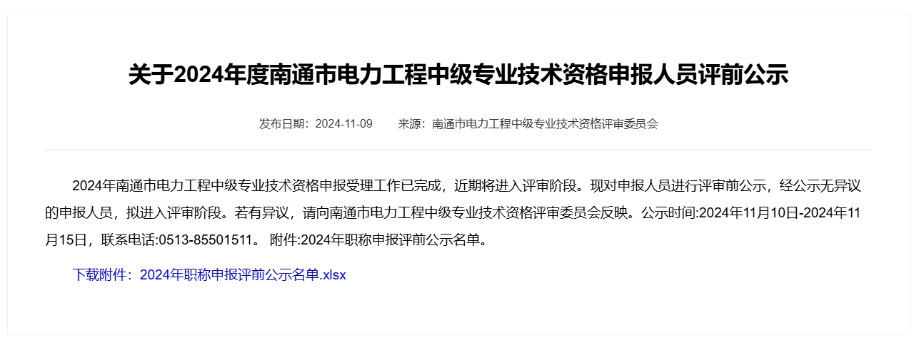 關(guān)于2024年度南通市電力工程中級(jí)專業(yè)技術(shù)資格申報(bào)人員評(píng)前公示