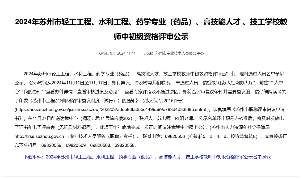 | 2024年蘇州市輕工工程、水利工程、藥學(xué)專業(yè)(藥品)、高技能人才、技工學(xué)校教師中初級資格評審公示名單 |