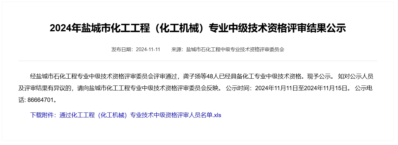 2024年鹽城市化工工程(化工機(jī)械)專業(yè)中級(jí)技術(shù)資格評(píng)審結(jié)果公示