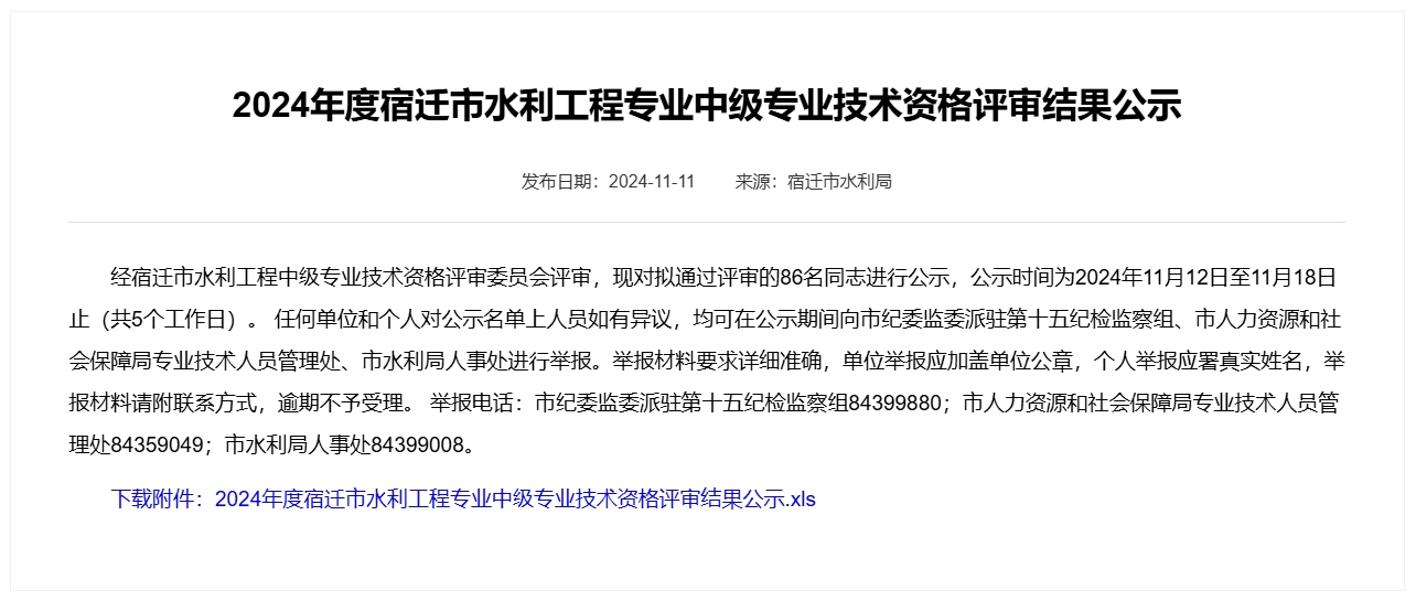 2024年度宿遷市水利工程專業(yè)中級(jí)專業(yè)技術(shù)資格評(píng)審結(jié)果公示