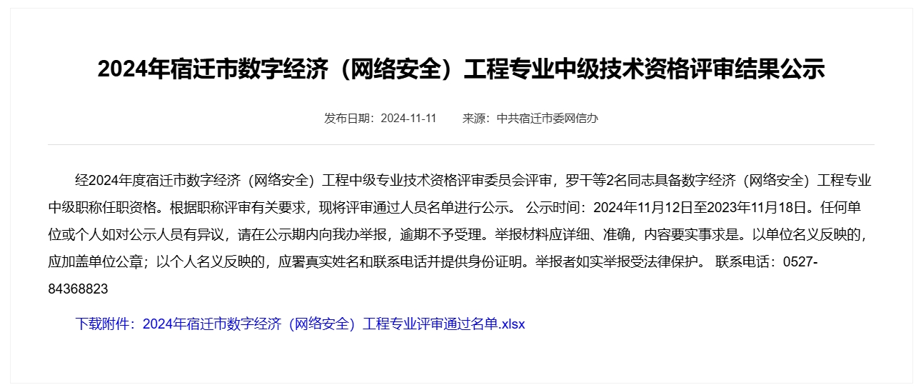 2024年宿遷市數(shù)字經(jīng)濟(jì)(網(wǎng)絡(luò)安全)工程專業(yè)中級技術(shù)資格評審結(jié)果公示