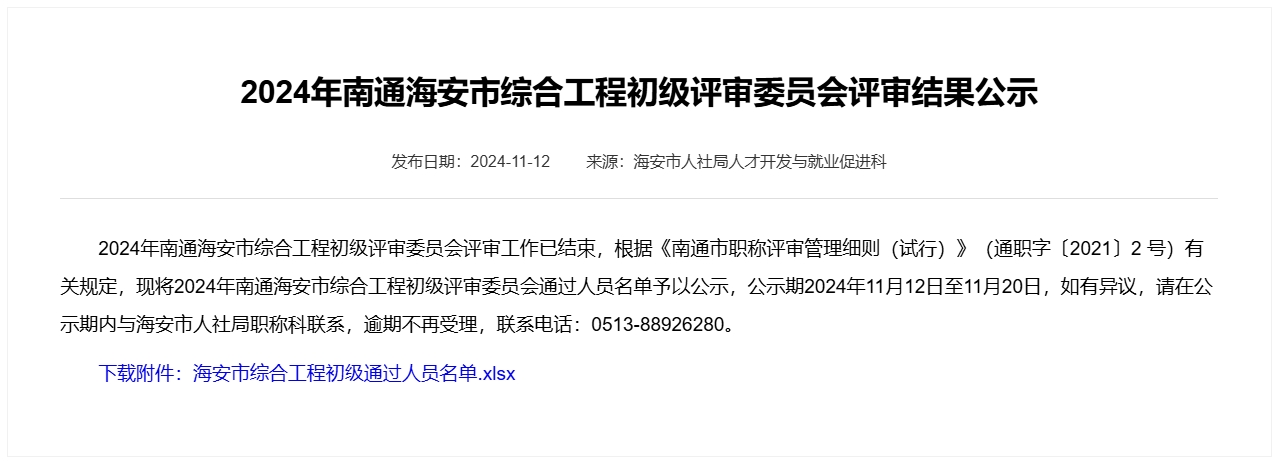 2024年南通海安市綜合工程初級(jí)評審委員會(huì)評審結(jié)果公示