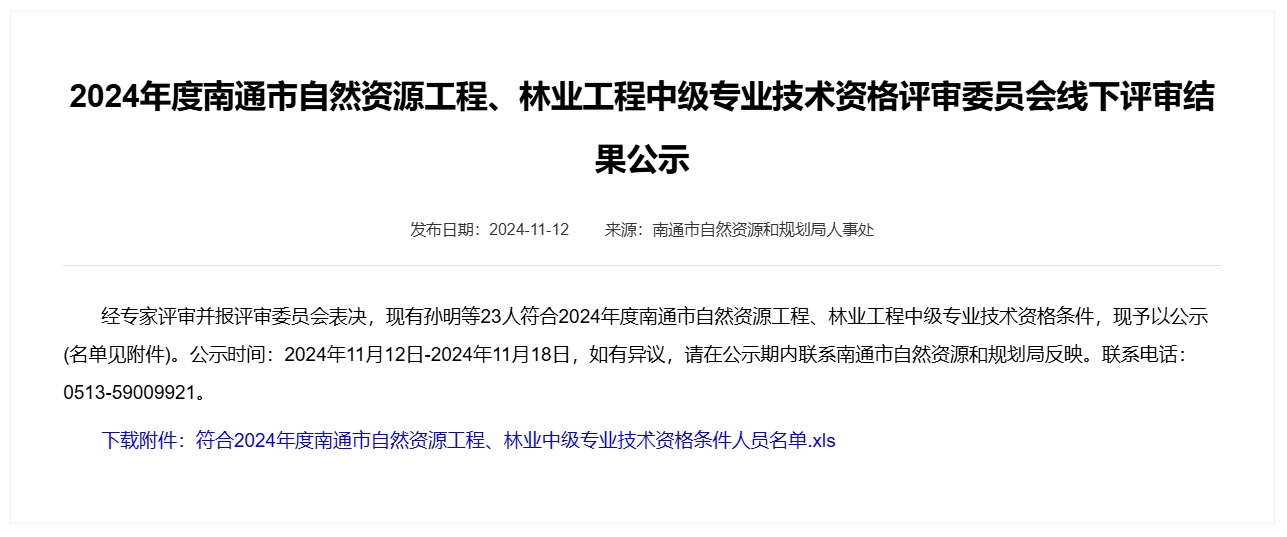 2024年度南通市自然資源工程、林業(yè)工程中級(jí)專業(yè)技術(shù)資格評(píng)審委員會(huì)線下評(píng)審結(jié)果公示