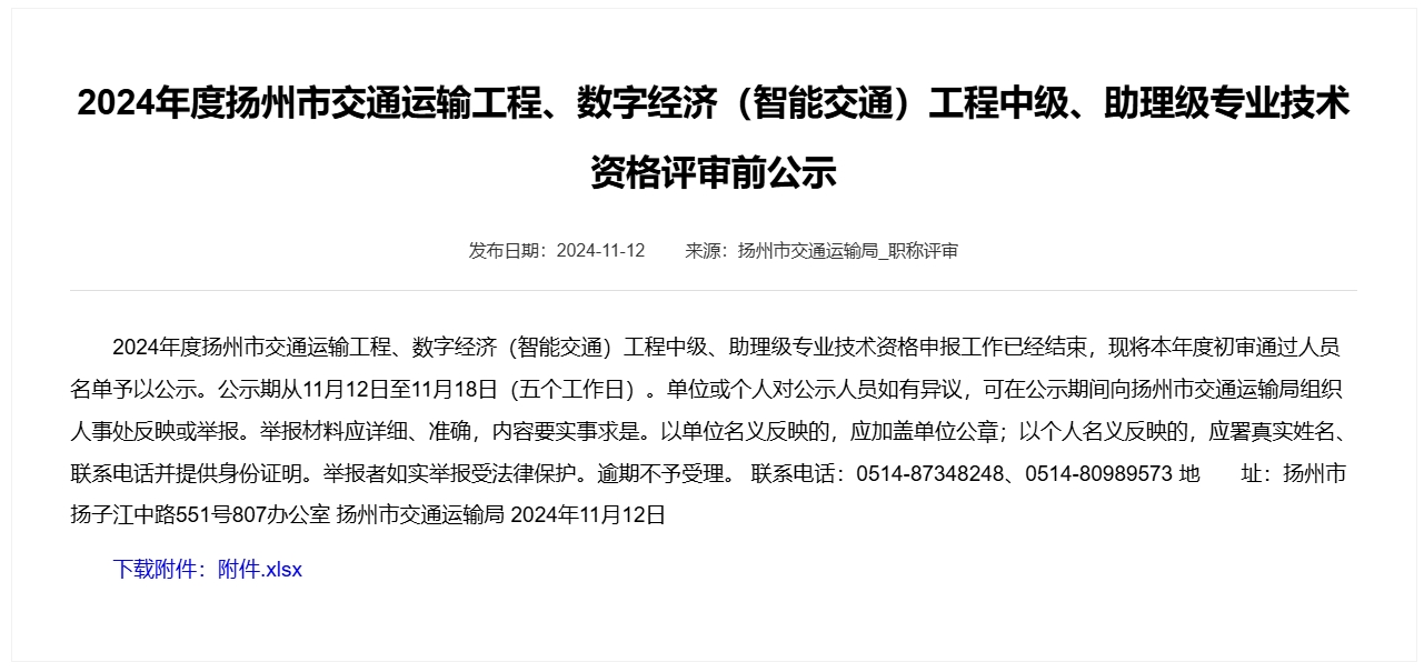 2024年度揚州市交通運輸工程、數(shù)字經(jīng)濟(智能交通)工程中級、助理級專業(yè)技術(shù)資格評審前公示