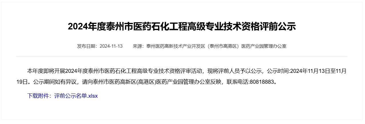 2024年度泰州市醫(yī)藥石化工程高級專業(yè)技術(shù)資格評前公示
